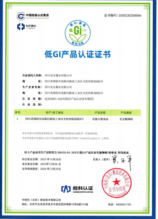 光友薯業(yè)對此次酸辣粉獲得低GI認(rèn)證表示非常榮幸和自豪,光友薯業(yè)表示,將繼續(xù)秉持“健康、美味、創(chuàng)新”的理念,不斷推出更多符合消費者需求的健康食品,為人們的健康生活貢獻更多力量。