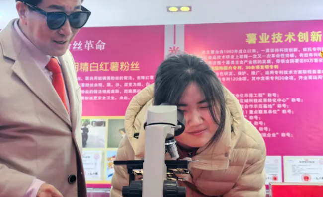 嘉賓們循著紅薯產(chǎn)業(yè)發(fā)展的足跡,先后探訪光友現(xiàn)代科技園、文化藝術(shù)園及旅游商品展銷現(xiàn)場(chǎng)。在農(nóng)耕文化展區(qū),大家俯身摩挲著斑駁的老式紅薯栽種木犁、竹編篩具,指尖觸碰間,仿佛與先輩農(nóng)耕歲月隔空對(duì)話;移步現(xiàn)代科技園,嘉賓們深入了解七次粉絲革命的發(fā)展歷程,通過(guò)顯微鏡直觀觀看淀粉分子結(jié)構(gòu)的奇妙變化,真切感受科技為紅薯產(chǎn)業(yè)賦能的硬核力量。